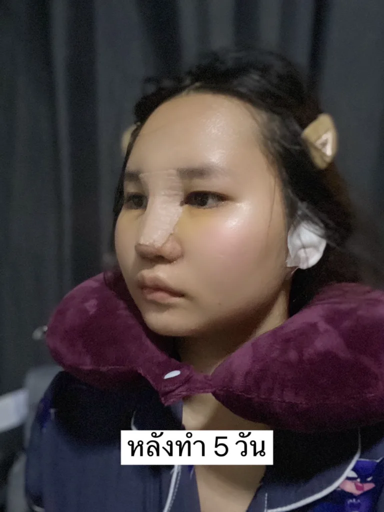 หลังทำ 5 วัน บวมช้ำบ้างเล็กน้อย แต่ทำงานได้ปกติ ใช้ชีวิตประจำวันได้ปกติเลยค่า แทบไม่ต้องพักฟื้นเลยย💕